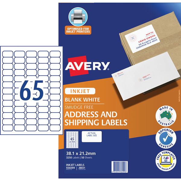 AVERY 936099 J8651 QUICK PEEL ADDRESS LABEL SURE FEED INKJET 65UP WHITE PACK 50