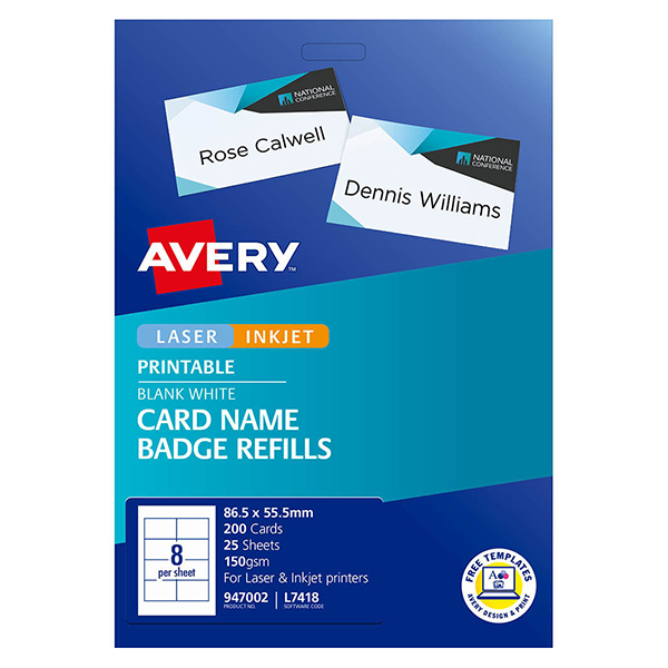 AVERY 947002 L7418K NAME BADGE CARD REFILLS 8UP 86.5 X 55.5MM WHITE PACK 200