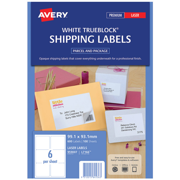 AVERY 959007 L7166 TRUEBLOCK SHIPPING LABEL LASER 6UP WHITE PACK 100