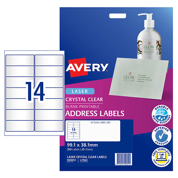 AVERY 959051 L7563 CRYSTAL CLEAR ADDRESS LABEL LASER 14UP CLEAR PACK 25
