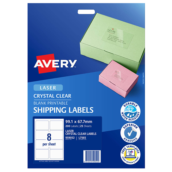 AVERY 959052 L7565 CRYSTAL CLEAR ADDRESS LABEL LASER 8UP CLEAR PACK 25