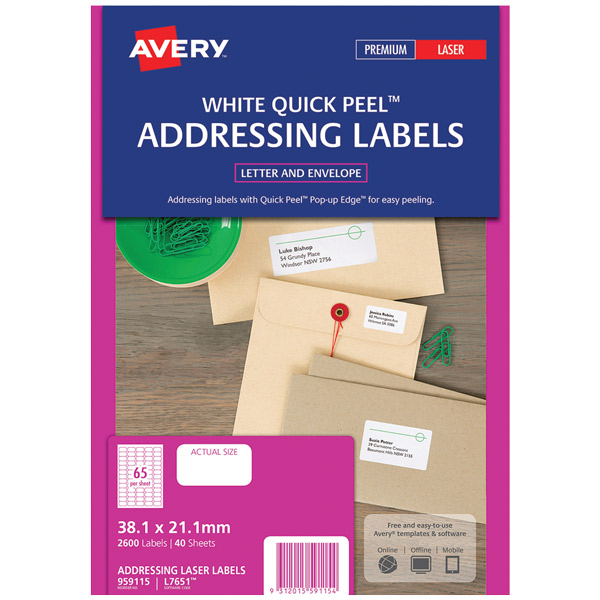 AVERY 959115 L7651 ADDRESS LABEL QUICK PEEL 65UP W38.1 X L21.2MM WHITE PACK 40