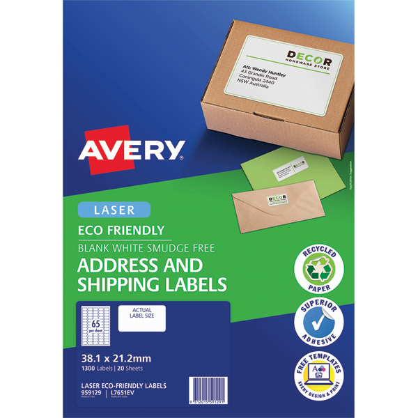 AVERY 959129 ECO FRIENDLY ADDRESS LABELS FSC W38.1 X L21.2MM 65UP PACK 20