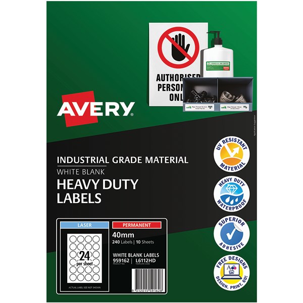 AVERY 959162 L6112HD MULTI-PURPOSE LABELS 40MM ROUND HEAVY DUTY WHITE PACK 240