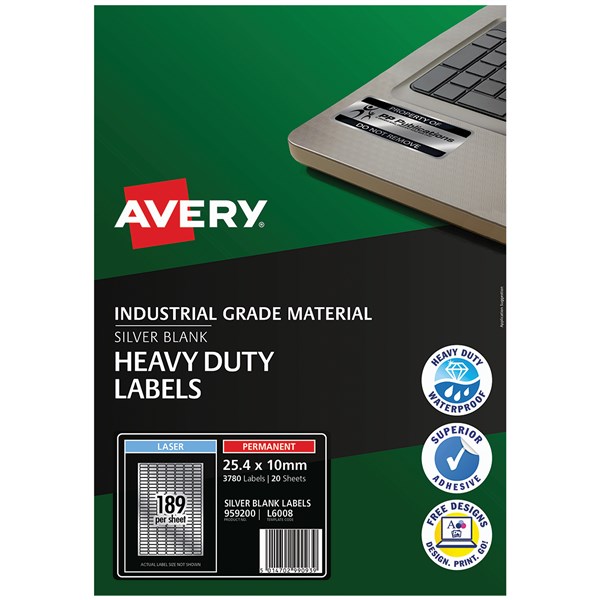AVERY 959200 L6008 DURABLE METALLIC HEAVY DUTY LABELS 189UP SILVER PACK 20