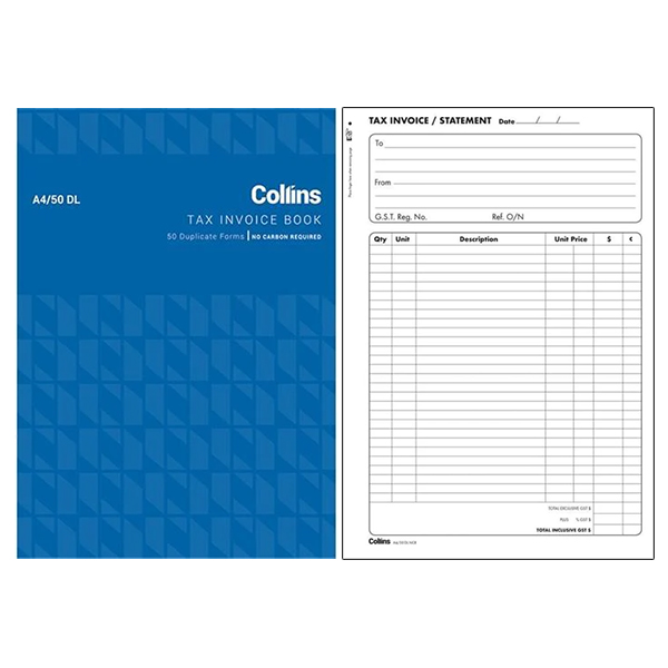 COLLINS TAX INVOICE BOOK 50 DL DUPLICATE NO CARBON REQUIRED A4 50 LEAF