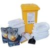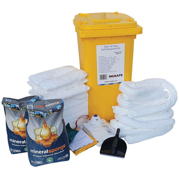 Kit Contains: 1x 240L Wheelie Bin, 110x Sorbent Pads, 10x 1.2m Sorbent Socks, 4x Sorbent Pillows, 2x 15kg Mineral Sponge, 4x Hazardous waste bags, 1x Pair Chemical gloves, 1x Pair Safety Goggles, 2x Pair Disposable Coveralls, 2x Disposable Masks, 1x Dustpan & Brush Set, 1x Waterproof instruction card