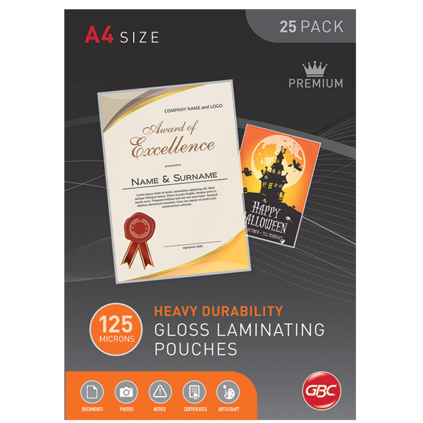 GBC LAMINATING POUCH GLOSS 125 MICRON A4 CLEAR PACK 100