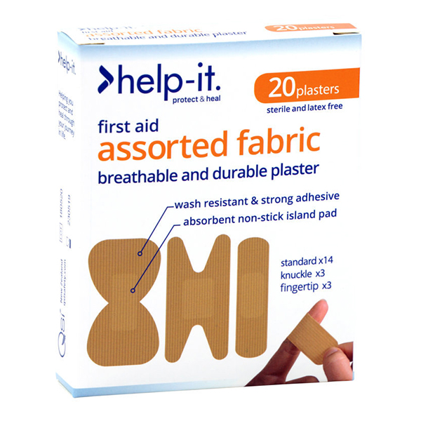 HELP-IT PLASTERS FABRIC ASSORTED 14 STANDARD, 3 FT, 3 KNUCKLE FLESH BOX 20