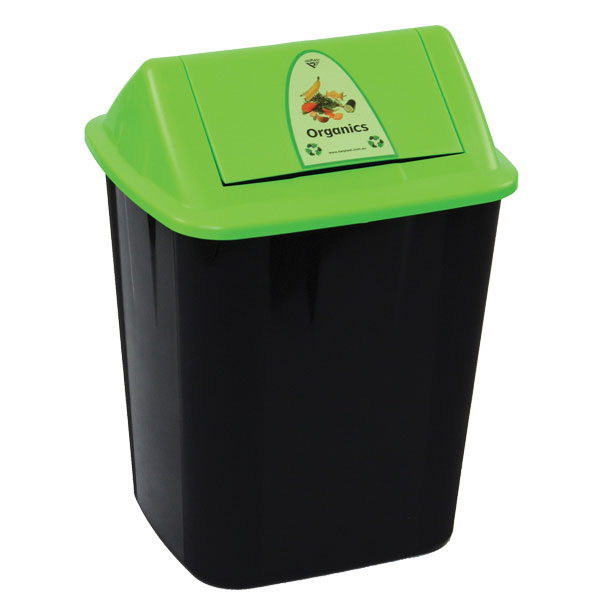 Black bin with green swing top lid