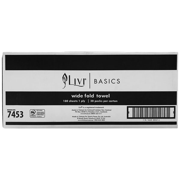 LIVI BASICS 7453 WIDE FOLD PAPER TOWEL 1PLY 180 SHEET CARTON 20