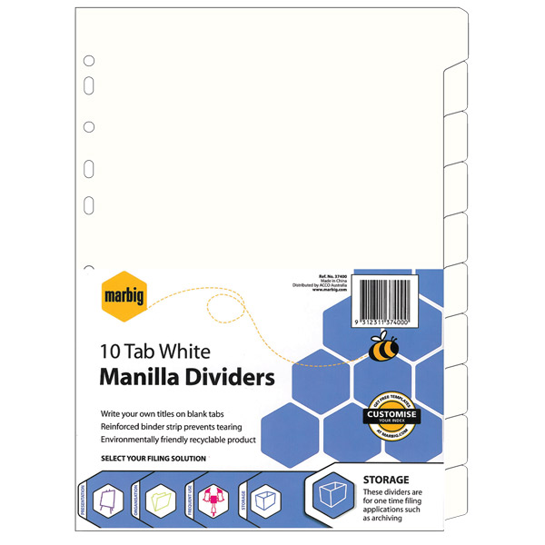 Marbig dividers are made from reinforced manilla board with plastic reinforced tabs and binder strips for durability and longer life