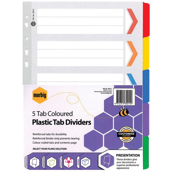 Marbig dividers are made from reinforced manilla board with plastic reinforced tabs and binder strips for durability and longer life