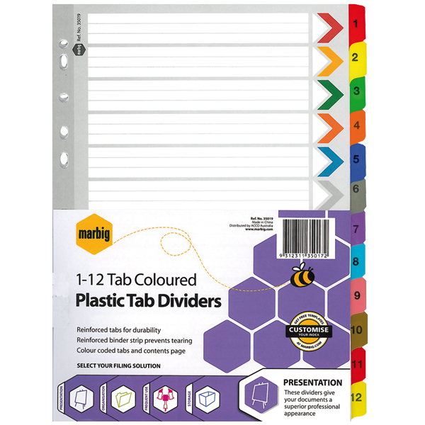 Marbig dividers are made from reinforced manilla board with plastic reinforced tabs and binder strips for durability and longer life