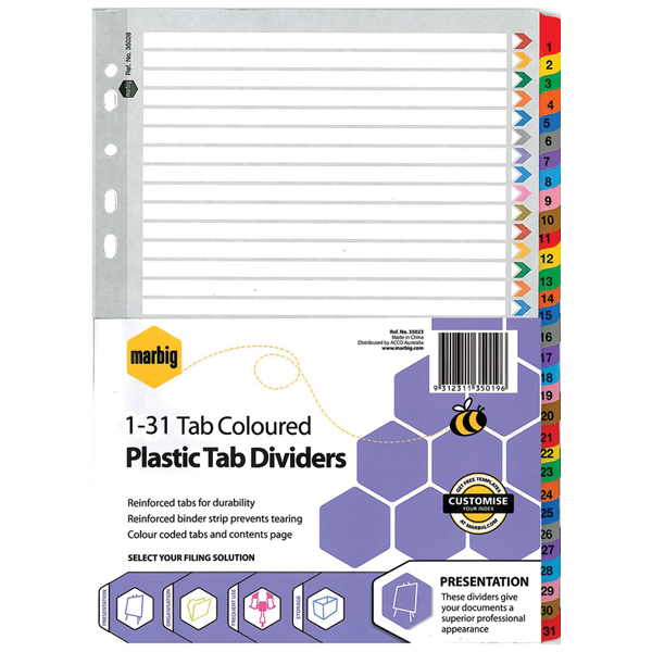 Marbig dividers are made from reinforced manilla board with plastic reinforced tabs and binder strips for durability and longer life