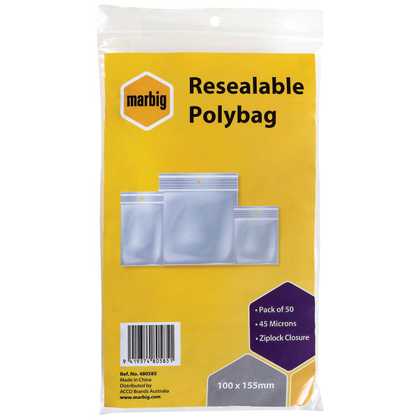 MARBIG PLASTIC BAG RESEALABLE 45MU W155 X L230MM CLEAR PACK 50
