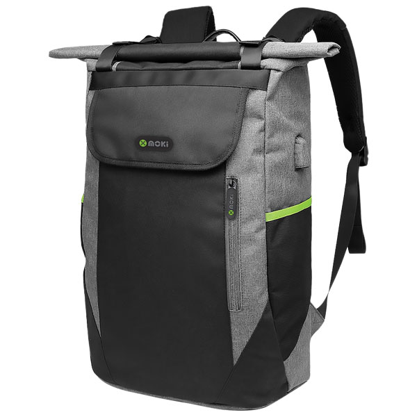 The Moki Roll-Top Backpack also features a USB port on the side, with a USB cable extender on the inside