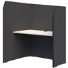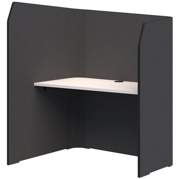 The high return wall shields users from distractions, while the angled desktop enhances privacy and acoustic performance