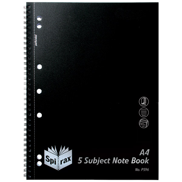 SPIRAX P596 5-SUBJECT NOTEBOOK 7MM RULED SIDE OPEN A4 250 PAGE BLACK