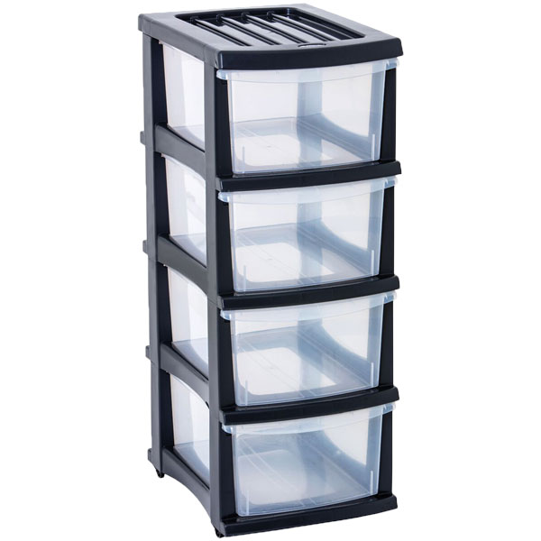 Robust plastic stand with clear drawers