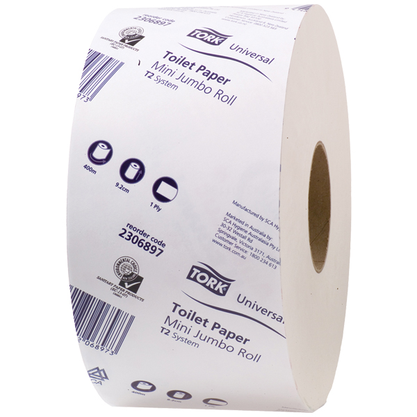 TORK 2306897 T2 UNIVERSAL MINI JUMBO TOILET ROLL 1 PLY 400M WHITE CARTON 12