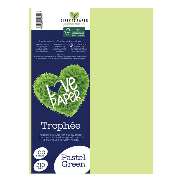 TROPHEE COLOURED PAPER A4 210GSM PASTEL GREEN PACK 100