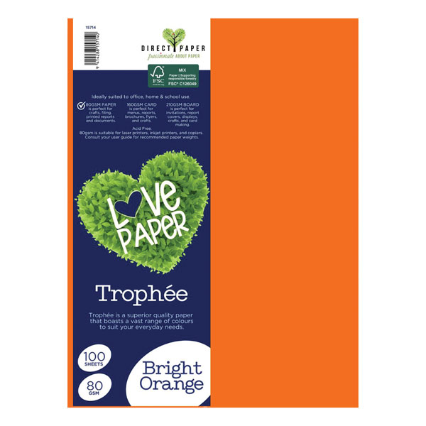 TROPHEE COLOURED PAPER A4 80GSM BRIGHT ORANGE PACK 100
